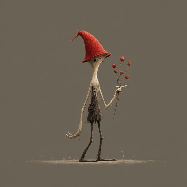 Treading softly across a muted, textural backdrop, an elongated, whimsical creature donned in a striking red hat gracefully carries a cluster of red berries. Each stride, purposeful yet restrained, contrasts sharply against the minimalist background that fades into the distance. The character’s svelte, fibrous body is crafted with meticulous detail, exuding an otherworldly elegance. Strands of beige and brown hair-like textures along its limbs and torso enhance its ethereal presence. The gentle clutch of vibrant red berries brings a burst of color, symbolizing life amidst seeming desolation. The pronounced conical hat not only catches the eye but hints at the hidden depths of its wearer’s untold story. This image, poised between the realms of fantasy and reality, invites the observer into a quiet narrative of solitude and possibly contemplation. Echoing themes of isolation and resilience, the artwork leaves a hauntingly beautiful impression, evoking emotions that resonate with each viewer's personal reflections.