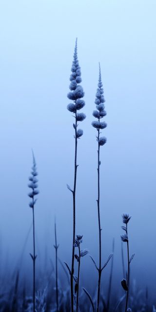 As the first light of dawn pierces the horizon, it reveals a spellbinding vista of frosted flowers standing tall against the hush of a misty countryside. Each blade of grass and delicate petal is sheathed in a fine crystal veil, their contours heightened against a serene, monochrome landscape where blues and whites merge in a dreamlike ballet. The stark, ethereal beauty of these floral spires, encased in ice, evoke a sense of quiet resilience and untouched purity, as they swivel gently in the chilly, whispering winds. This visual ode to the tranquil and often unseen moments of nature's morning awakening offers a peaceful pause, an invitation to reflect on the quieter moments of life. The image, with its subdued tones and minimalist allure, serves as a poignant reminder of nature's subtle artistry and the fleeting beauty of frost-kissed mornings. Amidst the monotone color palette, the scene vibrates with a silent energy, the life force of slumbering flora awaiting the sun's warming embrace. It's as if each blossom and leaf tells a tale of survival and grace-under-pressure, a testament to the enduring allure of the natural world even in its most fragile state.