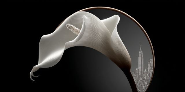 In an evocative blend of nature and urban sophistication, this artwork presents a stunning Calla Lily set against the New York City skyline. The silky white petals of the Calla Lily drape gracefully, forming a flowing silhouette that mirrors the soft yet dramatic curves of its structure. This juxtaposition of the flower's pristine natural beauty against the backdrop of Manhattan’s towering architectures resonates deeply with themes of resilience and balance. The sharp, monochromatic tones emphasize the contrast between the organic elements and the man-made world, underlining a narrative of coexistence in heterogenous environments. The use of darkness around the flower highlights the glow of the city, illustrating the ever-present lights of the urban landscape that never sleeps. This piece strikes a chord with viewers, capturing the essence of stillness amid the hustle of city life, and provokes contemplation on the integration of nature within metropolitan confines. A perfect synthesis of art and photography, this piece invites the audience to perceive the everyday world through a lens of beautifully crafted contrasts.
