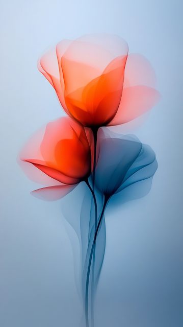 Bathed in an ethereal glow, the abstract floral artwork whispers tales of delicate beauty and nuanced shades transitioning effortlessly into one another. Capturing the grace of a blossoming flower, the artwork plays with a palette of vibrant orange, soothing coral, and cool shades of blue. Its petals, though artistically exaggerated and styled, unfold in a manner reminiscent of a gentle dance, elegantly swaying despite the stillness of the medium. The background's soft, muted blue provides a harmonious counterpoint that accentuates the flower's warm tones, crafting a visually striking contrast that beckons the viewer for a closer look.
