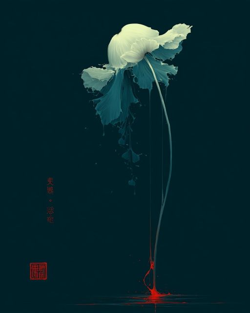 Suspended in an infinite ocean of deep teal, a delicate and transcendent white flower emerges, casting an ethereal glow across its dark surroundings. The artwork captures this floristic spectacle with a stunningly minimalist aesthetic, where the contrasts between light and dark weave a visual poetry. The flower, portrayed in wisps of pure white, seems almost alive—its petals unfurling gracefully into the abyss of calming turquoise. The stem, a slender filament of natural artistry, drips with red hues that signify the vitality and essence of life itself. This touch of red anchors the composition, suggesting a profound connection between the ethereal and the earthbound. Enhanced by the soft, flowing lines, the image invites viewers to lose themselves in its tranquil depths, evoking a sense of peace and contemplation. The artwork’s Asian-inspired elements, seen in the delicate calligraphy at the side, add layers of cultural depth and mystique, making it not just a visual experience but a bridge to philosophical explorations.