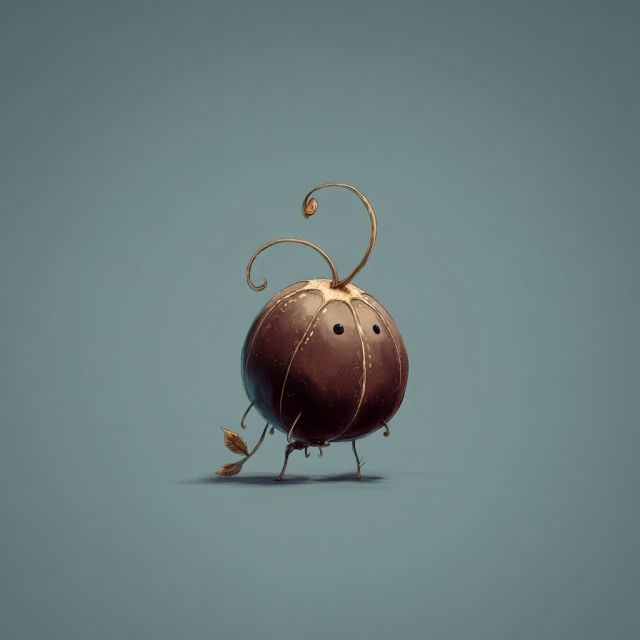 Imagine a world where whimsy and artistry blend seamlessly, nurturing a delightful visual feast for your senses. This thoughtfully crafted art piece invites you to a whimsical universe where a chocolate cherry, personified with a charm only artists could conjure, takes center stage. Painted against a muted blue background, the cherry's smooth, rich brown surface gleams subtly, resembling a fine piece of crafted chocolate polished to perfection. Silver lines and stitches run along its surface, hinting at a crafted metallic texture that adds a vintage touch to the piece. Two wide, curious eyes and a set of slender, whimsical legs give this cherry a lifelike persona, making it an appealing character in its own right. Each detail, from the delicate, spiraled stem that crowns the top to the tiny leaf fluttering beside it, is rendered with meticulous attention, showcasing the artist's mastery over blending everyday objects with imaginative elements. This engaging art print lures viewers into a gentle narrative, perhaps a quiet afternoon in a mystical land where animate treats roam free with personality and grace.