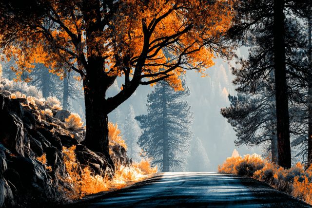 As dawn breaks, the first rays of light softly touch a winding road that delves into the heart of an ethereal forest. This canvas invites you into a realm where nature whispers ancient tales through golden leaves and towering trees. A crisp and invigorating air fills the scene, as the vibrant orange hues contrast dramatically with the deep blues of the paved path and the misty backdrop. The road, bordered by rugged stones and autumn-kissed foliage, curves gracefully, hinting at unseen wonders beyond the vanishing point. The tranquility of this isolated route is palpable, offering a solitary reprieve from the world's bustle. Each tree, bathed in fiery tones, stands as a sentinel of the changing seasons, their colors a fleeting masterpiece of time’s relentless march. Amid these serene surroundings, the viewer can almost hear the crunch of leaves underfoot and feel the cool shade provided by the outstretched branches overhead. This artwork does not just capture a view; it encapsulates a moment of introspective journeying, inviting contemplation on the beauty of transience and the quiet dignity of nature’s cyclical dance.