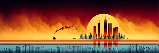 Bathed in a fiery glow, the Detroit skyline emerges as a stirring canvas of imagination and reality blended into a single frame. The artwork presents a cityscape transformed by the vivid tones of sunset, casting the iconic buildings in silhouette against a colossal orb of burning orange. On the tranquil waters, a solitary sailboat drifts, its sail a wisp against the vibrant backdrop, adding a touch of serenity to the urban fervor. This scene captures not just a city, but a moment of cosmic elegance and industrial might meeting at the twilight of day. The stark contrast between the fiery sky and the cool blue of the water's edge crafts a narrative of balance—where fiery passion meets placid calm. Trees dotting the horizon suggest life persists at the very edge of human civilization, hinting at nature’s subtle reclamation of space. Such imagery invites the viewer to contemplate the ephemeral beauty of urban landscapes, manipulated by light and color into a compelling spectacle that tugs at the strings of imagination and nostalgia.
