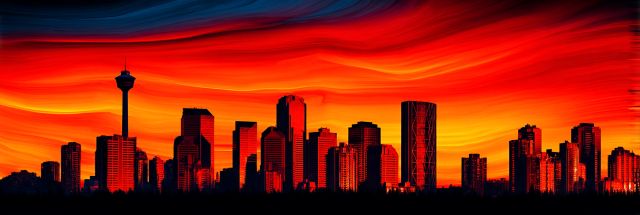 As the sun dips below the horizon, Calgary’s iconic skyline emerges as a striking silhouette against a sky ablaze with vibrant hues of orange, red, and yellow. This art piece captures a moment that transcends the everyday into the extraordinary, where the familiar forms of city buildings are dramatically transformed by an inferno of colors, reminiscent of the intense energy and creativity found at the Burning Man festival. The Calgary Tower stands tall, a standout among the skyscrapers, bathed in the fiery glow that seems to dance across the canvas. The artwork invites viewers to gaze intently, appreciating each building’s outline as they are softly etched against the swirling, vivid backdrop. This dynamic juxtaposition of urban calmness in the foreground with the wild, untamed sky stimulates a dialogue between civilization and the raw forces of nature. The image is more than a cityscape; it is a visionary exploration of form, color, and emotion, making any viewer pause in awe and reflect on the powerful beauty that unfolds when day turns into night.