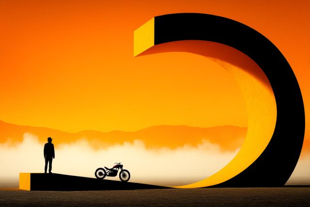 Beneath the expansive hues of a fiery orange sunset, an intriguing art tableau unfolds, inviting the viewer into a world that blurs the lines between reality and dream. In the foreground, a monumental, crescent-shaped structure dominates the landscape, its bold curve sharply contrasting with the soft, misty horizon. A solitary figure stands contemplatively by the massive sculpture, casting a long shadow that dances with the dying light. Near him, a vintage motorcycle rests, suggesting a journey paused or perhaps just begun. This scene evokes a sense of adventure and solitude, reminiscent of the expanse and freedom characteristic of festival landscapes like Burning Man, where art and vastness create an alternative reality. Layered within this composition are narratives of travel, introspection, and the eternal human quest for meaning amidst nature's grandeur. The artwork’s dramatic use of color and form captures the essence of a moment suspended in time, offering a portal to a liminal space where one can explore the deeper shades of their aspirations and dreams.
