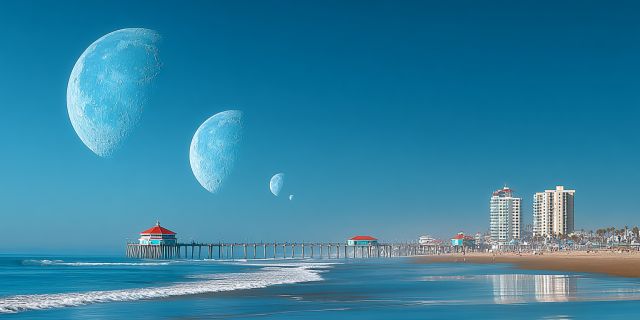 As the sun dips towards the horizon, Huntington Beach is bathed in a resplendent golden glow, transforming it into a scene straight out of a dream. The iconic pier stretches gracefully into the Pacific, flanked by vibrant beachfront buildings that reflect the fading sunlight. Above, a serene, blue sky serves as the canvas for an extraordinary celestial spectacle—three oversized moons looming majestically, lending a surreal touch to the Fourth of July festivities. This stirring image, with its blend of natural beauty and imaginative flair, invites viewers on a visual journey that celebrates both the familiar and the fantastical. The sharpness of the high-definition texture enhances every detail from the smooth sands beneath to the gentle ripples of the ocean, while the strategic placement of natural light amplifies the depth and dimension of this captivating scene. This art piece is not merely a photograph; it's an award-winning narrative that marries sci-fi elements with real-world settings, creating a juxtaposition that stirs curiosity and wonder. As the celebration of independence looms in the air, this representation of Huntington Beach encapsulates the essence of summer, freedom, and creativity, making it a timeless piece to behold.