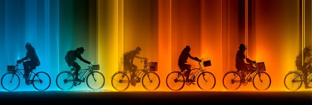 ** Dynamic Spectrum: Cyclists Against Vivid Multicolored Backdrops