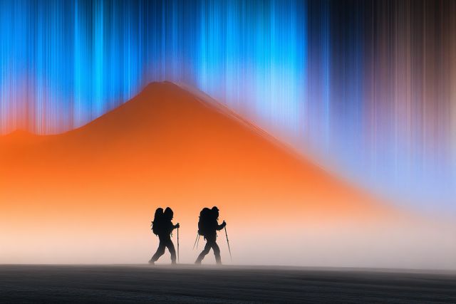 In an awe-inspiring dance of nature and adventure, two figures traverse an ethereal landscape under a sky ignited by the magical Aurora Borealis. Each step forward echoes the pulse of the wilderness, casting silhouettes against the iridescent glow that veins through the celestial expanse above. The backdrop is a dramatic juxtaposition of a fiery orange mountain peak, suggesting a volcanic presence or the last kiss of a sunset, colliding with the cool, spectral ribbons of the northern lights. This image, artfully blending the raw elements of fire and ice, invites the viewer into a narrative of resilience and exploration amidst the sublime forces of nature. As the hikers advance, poles in hand, they appear as intrepid spirits, embodying the quintessence of adventure against the canvas of the world's untouched frontiers. The atmospheric conditions swirl the colors of the scene into a poetic visualization of the planet's beautiful extremes, offering a captivating visual story that stirs the spirit and beckons the soul to wander.