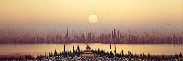 Bathed in a warm, golden glow, the New York skyline transforms into a canvas of dreams where the iconic urbanscape meets the whimsical, otherworldly spirit of the Burning Man festival. The image captivates with its infusion of fantasy and reality, where high-rise buildings blend seamlessly into the mist like mirages on a desert horizon. In the foreground, a geometrically distinctive pyramid structure, reminiscent of the intricate installations found at Burning Man, anchors the composition. This unexpected juxtaposition instills a sense of mystery and exploration, hinting at untold stories between the silhouettes of trees studded around its base. Above, the sky, streaked with hues of lavender and peach, hosts a modest yet poignant sun, overseeing the scene like a benign presence. A flock of birds, perhaps startled by the serenity of the evening or drawn to the light’s last dance, cuts silently across the sky, adding a dynamic element to the otherwise tranquil horizon. This artwork not only serves as a stunning visual spectacle but also evokes a meditative reflection on the coexistence of nature, human innovation, and artistic expression.