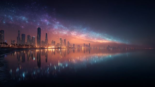 As dusk softly capitulates to the enigmatic embrace of night, San Jose’s skyline emerges as a breathtaking canvas of techno-spiritual splendor. This carefully orchestrated artwork marries the technological pulse of a city known for its seismic contributions to the tech world with an artistic touch that evokes a sense of calm and innovation. Stark silhouettes of skyscrapers rise, piercing the horizon while cradling a stream of glowing particles and cyber dots that weave through them like a digital aurora. The colors—a fusion of soft neon blue and soothing violet—wash over the scene, lending it an air of mystique and futuristic allure. Gentle reflections on the mirror-like water add a dreamlike quality, enhancing the visual depth and pulling observers into a serene, almost otherworldly realm. The photo's wide-angle perspective captures the expansive yet intimate nature of San Jose, framed by the volumetric light that spills from the heavens adding a cinematic quality to the tableau. This depiction is not just an ode to the city’s architectural finesse but a whisper of the unseen energy and pulsating life that flows beneath its streets. It invites viewers to linger, to delve deeper into the symphony of color and light, and to explore the harmonious dialogue between nature and human ingenuity, all captured in this single serendipitous moment.