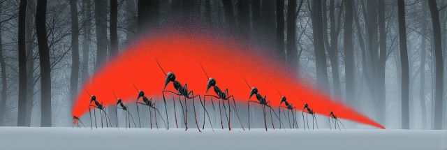 Within a cold, mist-laden forest, as if summoned by an otherworldly force, a line of ants embarks on a decisive journey. The setting is dense with monochromatic gray scales, the slender, wintry tree barks holding the fog sacredly within their midst. Amid this muted backdrop, the ants are illuminated by a stark, otherworldly flare of fiery red that encapsulates their formation. This intense orange-red gradient simulates a divine beacon casting bytes of shadows and light.