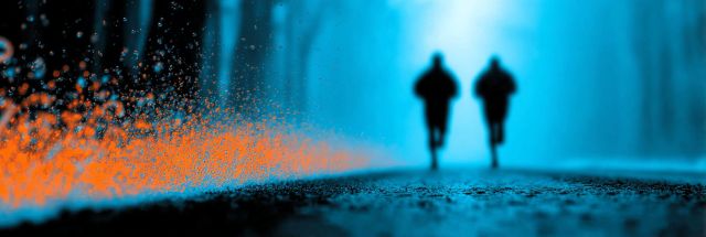 As the chill of winter wraps the earth in a frosty embrace, two silhouetted figures emerge on a road enveloped in the mysterious allure of twilight. The scene is alive with the dynamic contrast of warm and cold hues, where the inkiness of late evening is unexpectedly perforated by bursts of fiery orange and soothing teal. This artwork vividly captures the solitude and persistence of joggers against the natural elements, symbolizing resilience and determination.