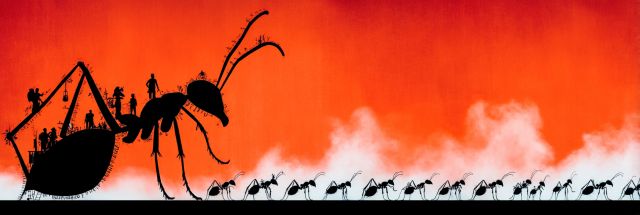 Under a blazing sky awash in hues of a deep, fiery red, a magnificent silhouette story unfolds, casting an awe-inspiring visage of giant ants traversing the barren landscape. This artwork, an exquisite canvas blend of realism and fantasy, presents these colossal ants as sentinels of the desert, each movement depicted with startling clarity against the burning backdrop. As if participants in a surreal parade, these ants dominate the expanse, a grand procession that sparks the imagination and pulls the viewer into a narrative that dances between the lines of mythical folklore and a dystopian future. With each ant meticulously designed to exhibit both strength and graceful form, the scene eloquently narrates the power of unity and the undying spirit of survival. Above them, the titanic ant, several times larger than its followers, serves as a striking focal point, its body holding aloft smaller figures that resemble human revelers at a distant, mystic festival. This art piece is not merely a depiction but a vibrant invitation to explore themes of community, resilience, and the stark beauty of adapted life in extreme conditions.