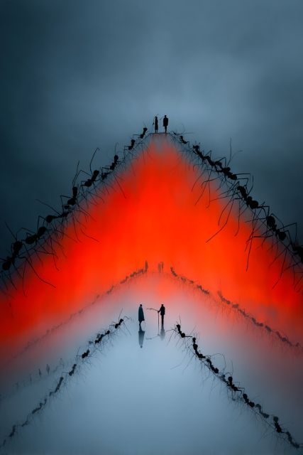 As the day fades into the twilight of distant worlds, the canvas before you opens into an extraordinary spectacle where millions of ants become cosmic architects in a fiery tableau. Aptly embodying the spirit of the Burning Man festival, this artwork merges the surreal with the natural in an unforgettable dance of color and form. Under a brooding sky, the ants work in harmony, their bodies forming the outline of an almost divine geometry. The vivid jewel tones of the artwork ignite the scene with a life force, suggesting the fiery undercurrents of creation itself. As the figures of two solitary individuals stand contemplating this majestic vista, their silhouetted forms add a touch of introspection, a narrative of connection amidst the chaos of creation. The viewer is drawn into a contemplation of infinity, where tiny creatures orchestrate the vastness of the universe under the watchful eyes of the human spirit. With each glance, the canvas reveals layers of meaning, weaving together themes of unity, creativity, and the boundless potential of the concerted minuscule. Imaginative and bold, this piece not only decorates a room but invigorates it with discussion and philosophical musing, making it a compelling centerpiece in any collection.