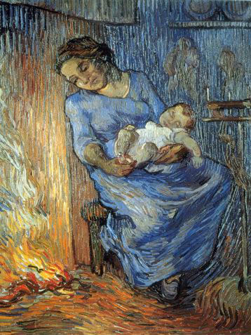 Title: The First Steps: A Mother Guiding Her Child By the Fire