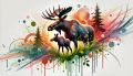 Vibrant Wilderness: Mother Moose and Calf Amidst Artistic Splashes