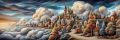 Enchanted Village at Dusk: A Canvas of Mystical Clouds and Timeless Architecture