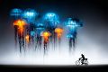 Illuminated Jellyfish Cascade and a Lone Cyclist: A Surreal Encounter