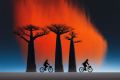 Twilight Cyclists Beneath Fiery Skies and Majestic Baobab Trees