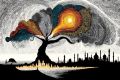 "Vibrant Whorls and Silhouettes: A Cosmic Tree Against an Urban Skyline"