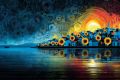 Sunflowers Set Against a Whimsical, Van Gogh-Inspired Village Skyline