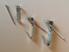 Similar to the traditional hangers, these hangers come in gold or silver, and are usually constructed of a thicker metal. The single metal rod is bent into a triangular shape where it connects to the wall, then drops down into a hook, in which the frame wire rests. The nail passes on a diagonal through the hanger and into the wall.