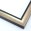 This solid wood canvas floater frame features a glossy brushed gold on the outside edge and topmost face. The inside step and base are a matte black.