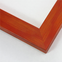 Simple 1-9/16 " molding. This frame has a scarlet red stain over a natural wood finish. The red is laid with a brush stoke effect, leaving the base color and grain visible. It has a smooth, laminate texture.