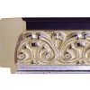 An ornate, solid wood frame featuring an intricate design overlaid with elegant silver leaf, and lightly antiqued. A shallow scooped profile and unadorned inner edge draw the eye inward. A dark brown outer edge highlights the design.