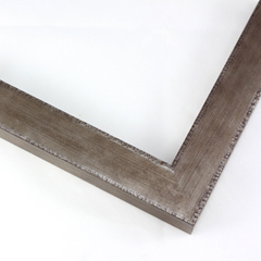 Slightly angled 1-1/4 " frame with an indented design on the inner and outer edge. The face is a metallic silver stain brushed over a warm grey-brown base. The accented inner and outer edge reveal more of the bright sold color and highlight the difference in texture.