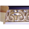 An ornate, solid wood frame featuring an intricate design overlaid with elegant silver leaf, and lightly antiqued.  A shallow scooped profile and unadorned inner edge draw the eye inward. A dark brown outer edge highlights the design.